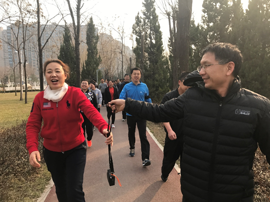 随着太阳成集团tyc33455cc工会主席孙金波同志的一声令下,健步走活动正式开始。在最前面领队的是经常参加健步走锻炼的谭业武经理、赵春波老师和杨玲玲老师,杨玲玲老师随身带着播放器给大家播放欢快的音乐来控制节奏。大家兴致高昂、阔步向前,欢快的笑语、携手的鼓励,奋力的角逐,畅快的汗水,一并挥洒在路上,形成一道与自然和谐共处的亮丽风景。