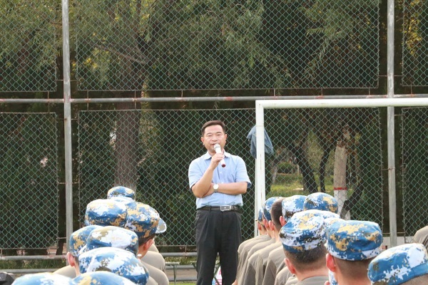首先,马老师代表公司全体师生员工,向带训老师和参训同学表示亲切的慰问,紧接着阐明了军训的重要意义,并向同学们几点提出希望:提高认识,弘扬爱国主义精神,端正态度,严明纪律,听从指挥。随后,党总支副书记孙金波发表讲话,他要求参训人员在思想上,务必加强安全意识,注意教官与同学们的思想沟通,做好不怕吃苦的思想准备;行为上,严格要求自己,提高自身素质,做校园文明的代表者,以优异成绩回报给家长、学校。最后,马盛楠对参训新同学寄予美好的祝愿。