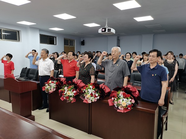活动首先由员工党员为公司光荣在党30年的老党员李相国、孙孟奎、陈敏、王保中同志献花。周鑫同志带领全体教师一起回顾了四位老党员为太阳成集团tyc33455cc发展所取得的成绩,并送上对四位老党员的祝福。随后全体党员同志佩戴党徽,面向鲜艳的党旗,在周鑫同志的带领下,大家列队整齐,举起右手,在党旗下庄严宣誓。许多党员顿时热泪盈眶,激动不已,同志们高亢而又洪亮的声音在会议室久久回荡。